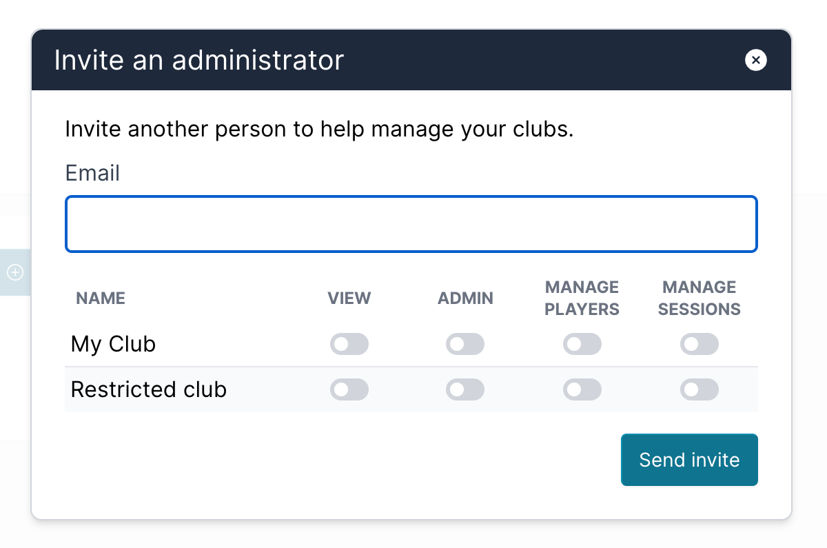 Click on the "Invite" button to invite an administrator to your club. You will need to enter their email address.