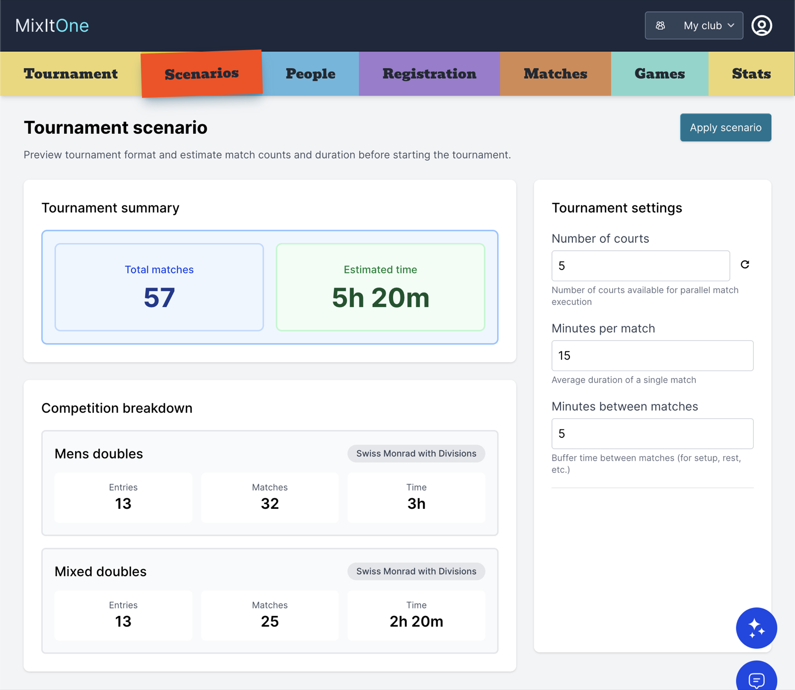 A scenario is a simulation of your tournament that shows the total number of matches across all competitions and how long the tournament will take based on your settings. You can test different formats, entry counts, and court configurations to find the optimal setup before committing to your tournament configuration.